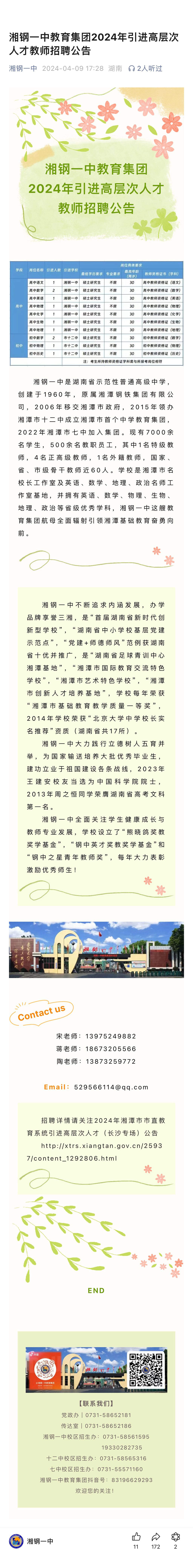 湘钢一中教育集团2024年引进高层次人才教师招聘公告