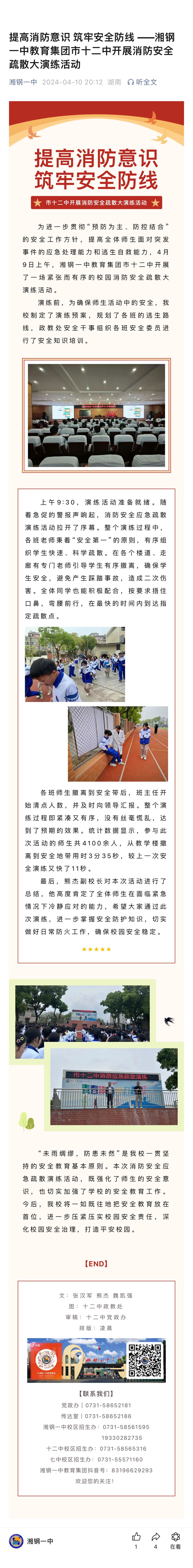 提高消防意识 筑牢安全防线 ——湘钢一中教育集团市十二中开展消防安全疏散大演练活动