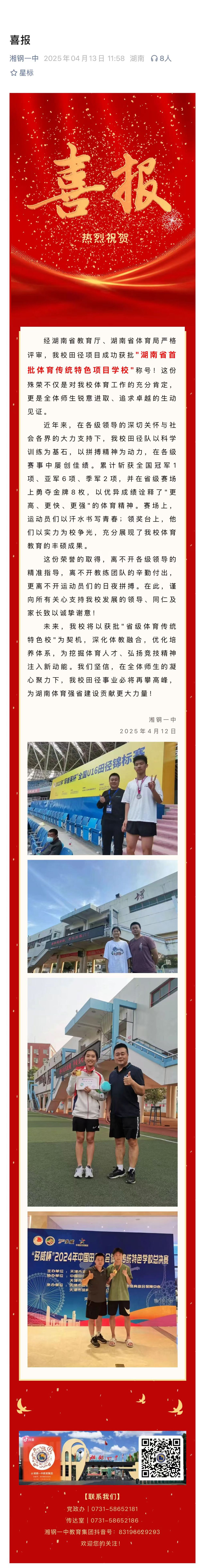 喜报:我校田径项目成功获批"湖南省首批体育传统特色项目学校"称号