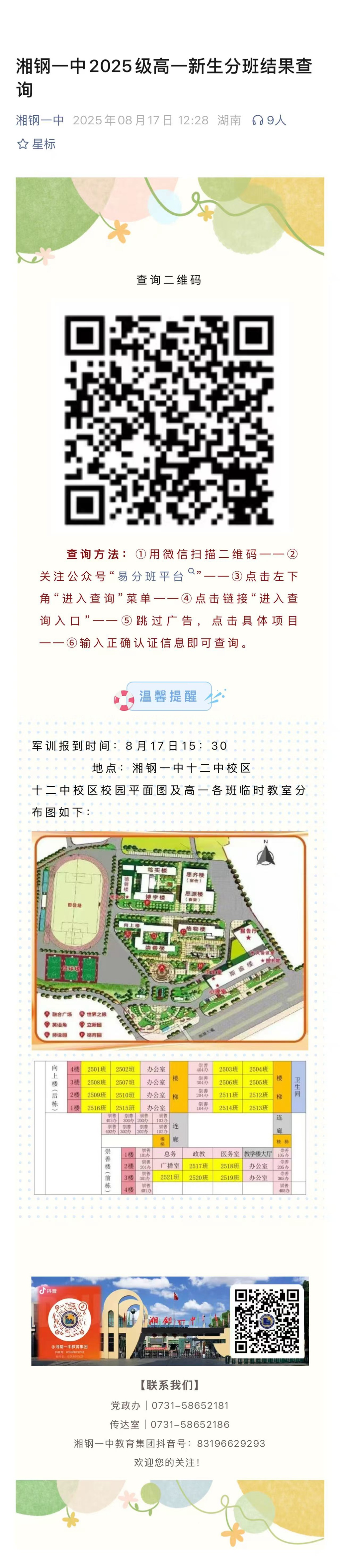 湘钢一中2025级高一新生分班结果查询