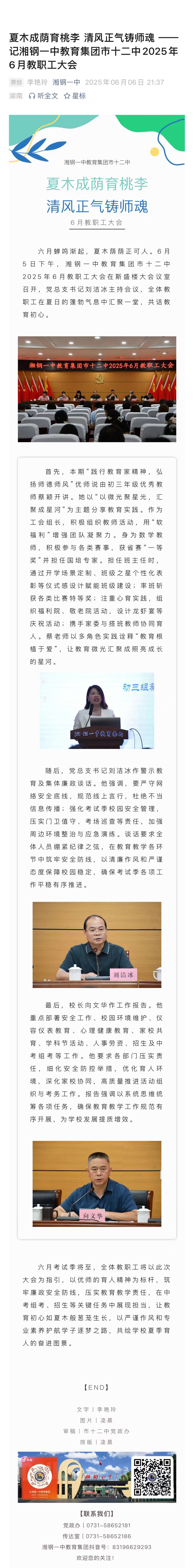 夏木成荫育桃李 清风正气铸师魂 ——记湘钢一中教育集团市十二中2025年6月教职工大会