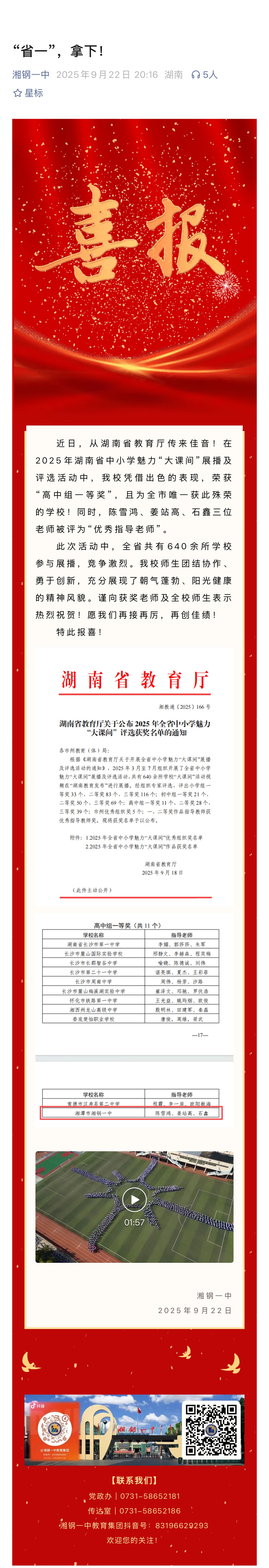 喜报:在2025年湖南省中小学魅力“大课间”展播及评选活动中,我校凭借出色的表现,荣获“高中组一等奖”,且为全市唯一获此殊荣的学校!同时,陈雪鸿、姜站高、石鑫三位老师被评为“优秀指导老师”。